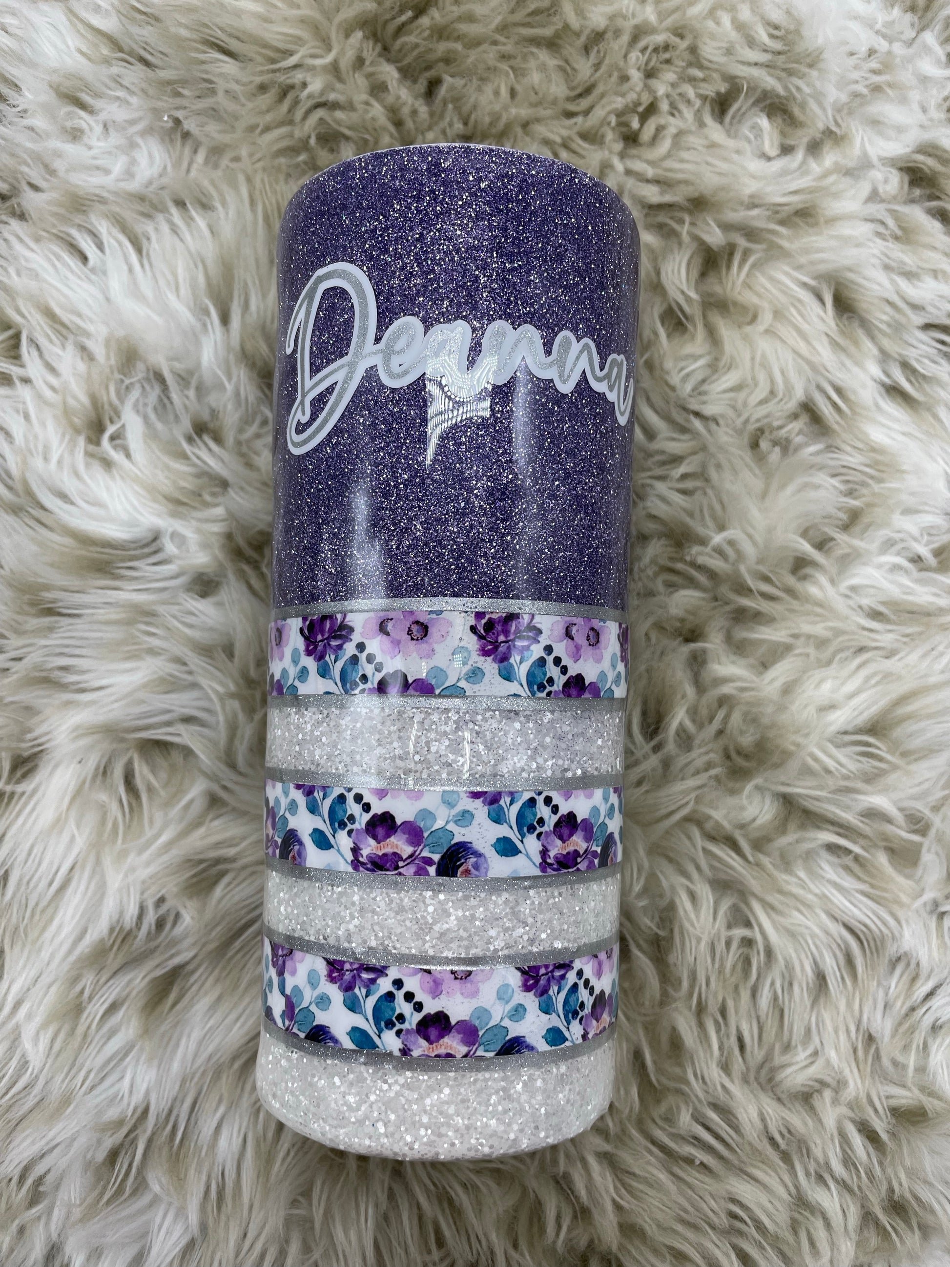 This is available in a 20 ounce or 30 ounce size. Made with glitter on a skinny/strait formed tumbler. Sealed with a high quality countertop epoxy gives it a glass like finish. Select your color of glitter at checkout and the flowers will be changed to match your color of choice. Add a note with purchase stating the name you’d like added or send me an email with order info and the name you’d like added!