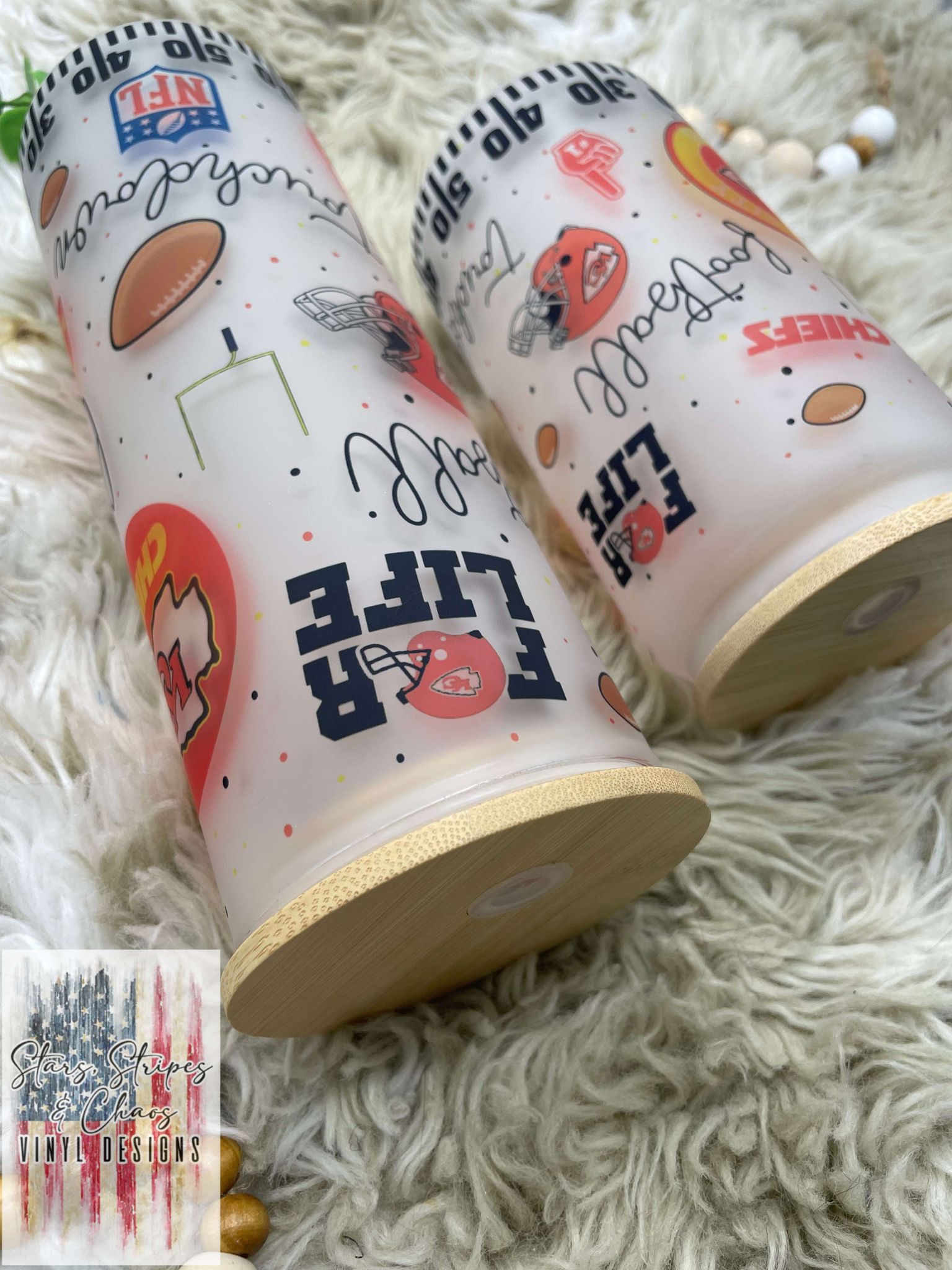 These are made on frosted glass tumblers. They come with a bamboo lid and plastic straw.
