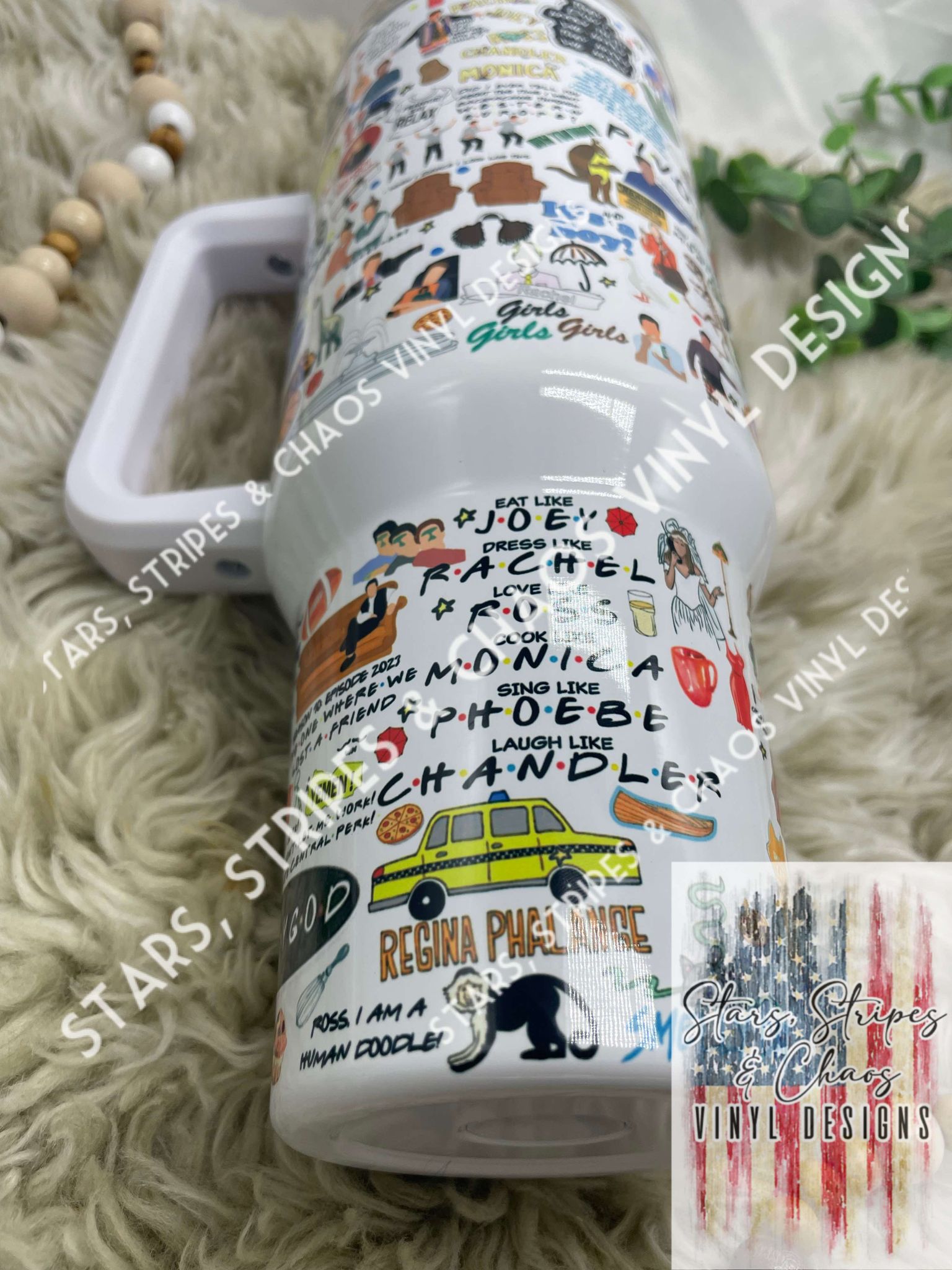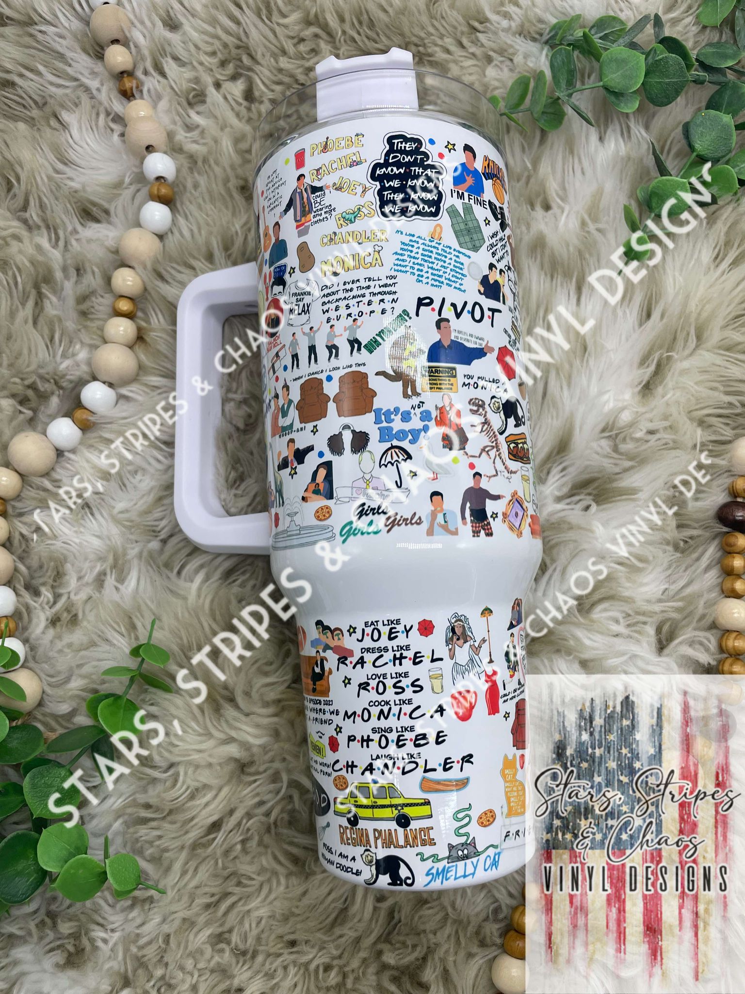This tumbler is a unique, one of a kind must have tumbler for anyone who loves the tv series Friends. It has a variety of different scenes, quotes and icons from the show collaged around the cup.